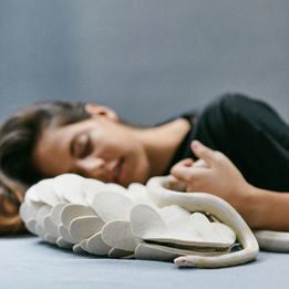I work with materials that, like the body, are both sensitive and resilient: wool felt, glazed ceramic, metals, beads, threads. Each object is stitched or assembled by hand — a way to soothe the mind, to surround the worry with beauty.